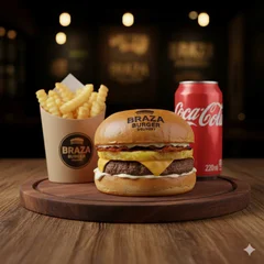 O sabor autêntico Braza! Pão brioche macio, hambúrguer artesanal (120g), queijo cheddar derretido e a maionese da casa. Acompanha batata frita crocante e um pote de molho da casa para a fritas. A combinação ideal para sua fome!