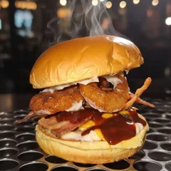 Sinta o sabor único do Braza Onion Bacon, um hambúrguer artesanal 120g na brasa preparado com pão brioche macio,aneis de cebola, bacon crocante, queijo cheddar derretido, maionese tradicional e molho barbecue.