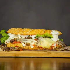 🥖 Baguete Gaúcha – Picanha no ponto e sabor marcante A nobreza da picanha grelhada, servida em tiras suculentas no nosso pão baguete artesanal, com uma generosa camada de cream cheese, queijo mussarela derretido, vinagrete fresco, alface crocante e o toque final do molho especial da casa. Um lanche robusto, inspirado no sabor das melhores churrasqueiras do sul – feito pra quem entende de carne boa.