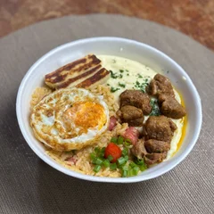 Nosso Delicioso Arroz com Cupim Desfiado, Linguiça de Pernil Fina, Linguiça Caipira e cozido com todos os temperos e sabores do preparo do cupim, acompanhado da nossa Mouseline de Mandioca Cremosa e Farofa de Cebola Caramelizada, 2 tiras de cupim de colher, finalizado com Salsinha, Cebolinha e Pimenta Biquinho. 🍛 O que vem na marmita média (1Kg de Comida)⬇ ✓ Arroz de Cupim (500g) ✓ 4 tiras de cupim (200g) ✓ Mouseline de Mandioca Cremosa na Manteiga (200g) ✓ 1 Ovo frito (50g em média) ✓ Queijo Coalho (40g) ✓ Farofa de cebola caramelizada (50g)