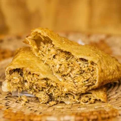 Recheio suculento de carne seca desfiada, acompanhado por temperos especiais.