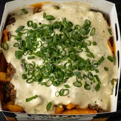 Batata frita com cheddar cremoso, 1 smash (carne), picles, maionese do HC e cheiro verde.