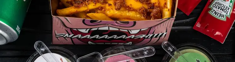 1 Smash Burger duplo (180g de carne in natura) da sua escolha + Fritas com cheddar e bacon.