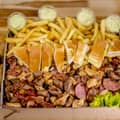 300 g de batata frita, frango, coração, alcatra, calabresa, bacon, pão com maionese, queijo e orégano. Serve 2 pessoas