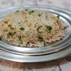 Arroz, frango desfiado, ervilha, molho ao sugo, cebola e parmesão ralado