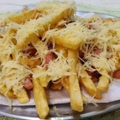 Grelhada com arroz cheiroso, farofa, fritas e duas fatias de bacon