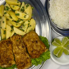 Filé a Milanesa Recheado com Muçarela e Presunto com Batata soté e enfeite de Palmito e arroz. Você pode escolher qual carne: Contra, Mignon, Frango ou Lombo