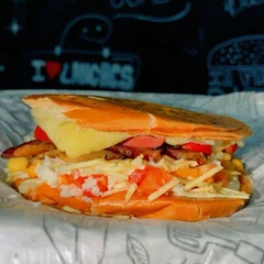 Pão,Purê, maionese, vinagrete, alface, milho, bacon, frango desfiado, 2 ovos, batata palha, 2 hambúrguer, 2 presuntos, 2 mussarela e calabresa em dobro.