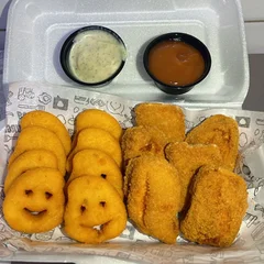 6 anéis de cebola, 6 iscas de frango e 1 batata pequena com cheddar e bacon.