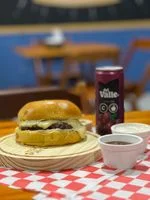 Pão brioche, 2 hambúrgueres 150g, cheddar, bacon, ovo, requeijão catupiry, molho cheddar, tomate, alface, cebola roxa e molho da casa.