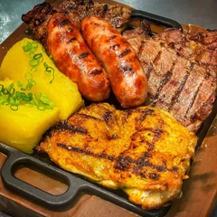 Uma seleção especial com os melhores cortes da casa: bife ancho, filé mignon, filé de frango e linguiça na brasa. Uma combinação perfeita para quem gosta de variedade e carne bem preparada. 🍚 Acompanha arroz branco, mandioca cozida, farofa da casa, salada verde e vinagrete. ⚠️ Aviso do Cardápio Não realizamos trocas, alterações ou substituições nos itens dos burguers e pratos.