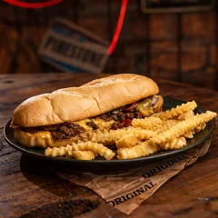 Suculentas tiras de carne grelhadas na chapa, com queijo derretendo a cada mordida. Servidas no pão baguete crocante por fora e macio por dentro. 🍟 Acompanha fritas crocantes e Maionese Original da casa. ⚠️ Aviso do Cardápio Não realizamos trocas, alterações ou substituições nos itens dos burgers e pratos.