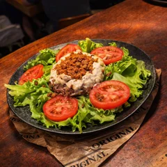 Cubos de filé mignon salteados na chapa quente, suculentos e cheios de sabor. Preparados com cebola, tomate, cebolinha fresca e pimenta biquinho. 🍟 Servido com fritas crocantes e vinagrete da casa. ⚠️ Aviso do Cardápio Não realizamos trocas, alterações ou substituições nos itens dos burguers e pratos.
