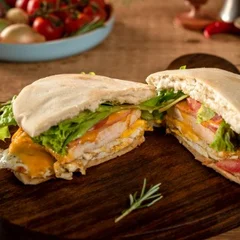Pão Sírio assado a baixa temperatura com lascas de parmesão, molho especial da casa, maionese, lascas de peito de frango levemente temperado, molho barbecue, ovos, Mussarella, alface, cebola e tomate.