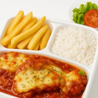 Filé de frango empanado, coberto com molho de tomate caseiro e queijo gratinado, acompanhado de arroz soltinho, batata frita crocante e salada fresca embalados separadamente para manter o sabor e textura. 📢 ⚠️ *Este prato é preparado na hora e, por isso, possui um tempo adicional de preparo de aproximadamente +30 minutos a mais.*