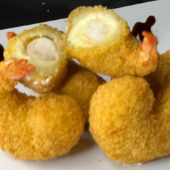 Camarão esvicerado, recheado com catupiry. empanado e frito.