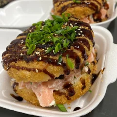 Base (casca) feita de arroz, salmão grelhado, cream cheese e especiarias. Empanado na farinha Panko e frito. Recheio e adicionais a sua escolha! Acompanha 2 shoyu de 10ml e 1 potinho de tare acompanha 02 sachês de shoyu + 01 potinho de tarê.