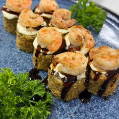Camarões esvicerados, salteados na manteiga Promissão com especiarias. (alga, arroz, camarões, cream cheese) Acompanha 1 shoyu sache de 10 ml