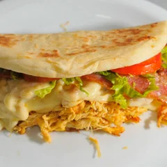 Pão árabe recheado com suculento filé de frango grelhado, ovo cremoso, queijo derretido, frescas folhas de alface e tomate maduro. Uma explosão de sabores!