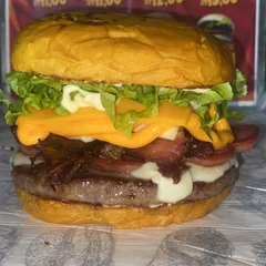 Pão, 2 carne, queijo, bacon, calabresa, ovo, alface, maionese, molho verde e cheddar.