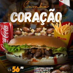 Os ingredientes do Calotinha Coração são: coração, cebola, 1 ovo, 1 fatia de queijo, milho, tomate, alface, ketchup, mostarda e a maionese do X Calota.