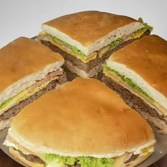 6 hambúrgueres artesanais, 4 ovos, 4 presuntos, 4 queijos, maionese, ketchup, mostarda, milho, tomate e alface.