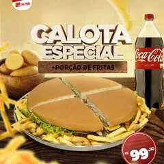 Calotinha Especial + Fritas P + Coca cola 200ml Os ingredientes do Calotinha Especial são: 1 hambúrguer de carne bovina, 1 ovo, 1 fatia de presunto, 1 fatia de queijo, milho, tomate, alface, ketchup, mostarda e a maionese do X Calota. O Calotinha tem 14cm de diâmetro, é um xis de tamanho normal que recomendamos para 1 pessoa (🍔)