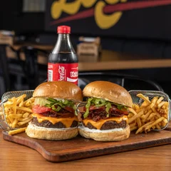 Dois hambúrgueres no pão brioche com bife de 180g, duplo cheddar, bacon crocante, alface, tomate e molho especial. Acompanha 2 batatas fritas(100g cada) + refrigerante 600ml. Completo, farto e perfeito pra dividir. 🍔🔥 Serve 2 Pessoas